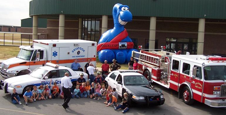 The character’s big bold image instantly attracts the attention of children everywhere it is displayed. Without a single word this unique child safety character sends his important message… Buckle Up All Of Us!!!