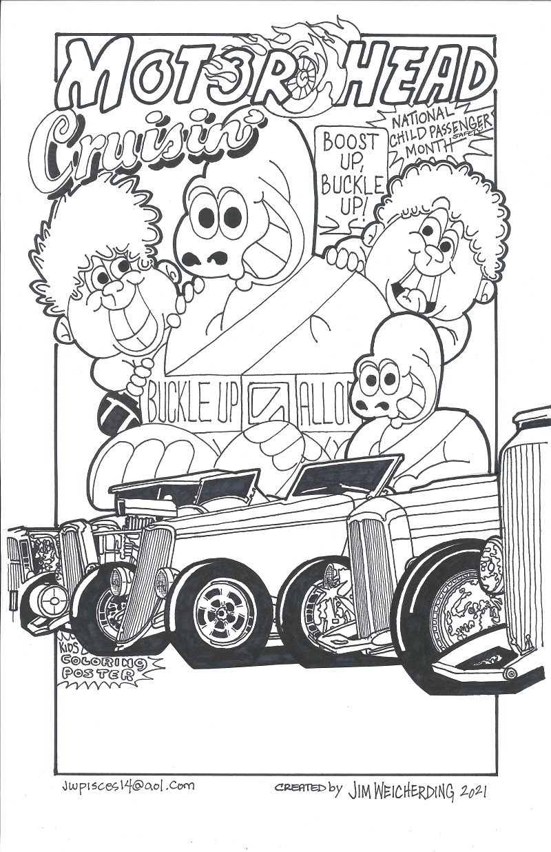 Buckleupallofus Kids Safety Products Available Online is significantly one of the biggest moves forward for this Award-Winning, child passenger safety cartoon character for kids and vehicle safety. For many years, Bucky giant balloon has been showcasing at charity car shows and community events across New England and New York State reminding kids and families to boost up, buckle up and properly secure infants in rear-facing car seats installed in vehicle backseats. Thousands of Bucky child passenger safety coloring posters, fridge magnets, stickers, 4-page coloring books and full color posters have been passed out to kids at 100’s of classic car and truck shows, cruise nights, race tracks and community events over the years but never had an online presence that enables police departments, classic car and truck clubs, libraries, daycares, community centers, family clinics and pediatric doctors offices with the opportunity to purchase Bucky products and items on a secured E-Commerce website with credit cards. It’s obviously very difficult to be everywhere with the Bucky giant balloon and provide everyone with Bucky products and items in-person as handouts for the kids attending all of these car shows and events. The demand for Bucky has increased dramatically over the past five years, not only here in the New England and New York State areas, but on a national level as well. The two-and-a-half-year pandemic reduced demand for event appearances but the demand for merchandise and products continues to grow. The brand new website: www.BUCKLEUPALLOFUS.us is currently featuring Bucky full color, 3″ x 4″, high quality and durable fridge magnets as the product catalyst with more products and items to be introduced down the road. Bucky fridge magnets are fantastic handouts to kids attending car shows and community events across the USA throughout the year. Bucky’s graphics and vehicle safety messages are also a great daily reminder displayed on family refrigerators for family members and friends. The family refrigerator doors are opened and closed throughout the day and evening seven days a week. What a great way to remind everyone to BUCKLEUPALLOFUS! This Sunday Feature has the Bucky Fridge Magnet graphics along with a cool Motorhead Cruisin’ Bucky Coloring Cartoon for the kids to color in. There is even space for kids to write and color their very own Bucky safety tips. Car show season ends soon so enjoy these coloring cartoons while you can.
